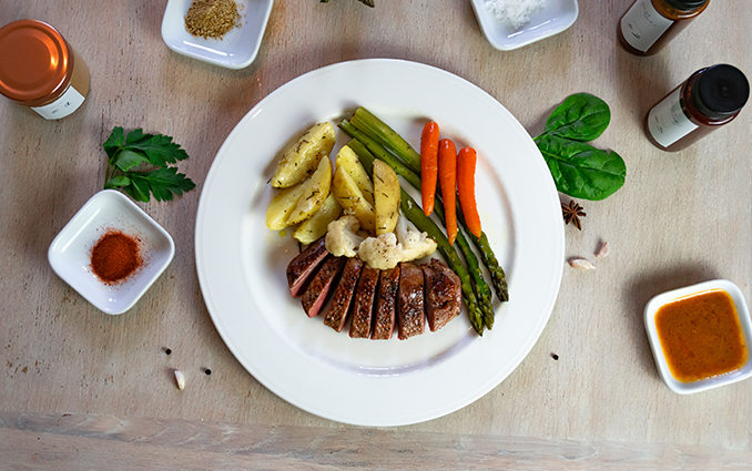 Abgerundet wird das Menü mit unseren klassischen Beilagen – grüner Spargel, Möhren, Blumenkohl und Rosmarinkartoffeln. Sie bestimmen beim Anbraten, wie knusprig die Haut Ihrer Entenbrust werden soll und kontrollieren auf diese Weise im finalen Schritt selber das Ergebnis.