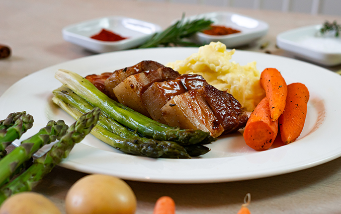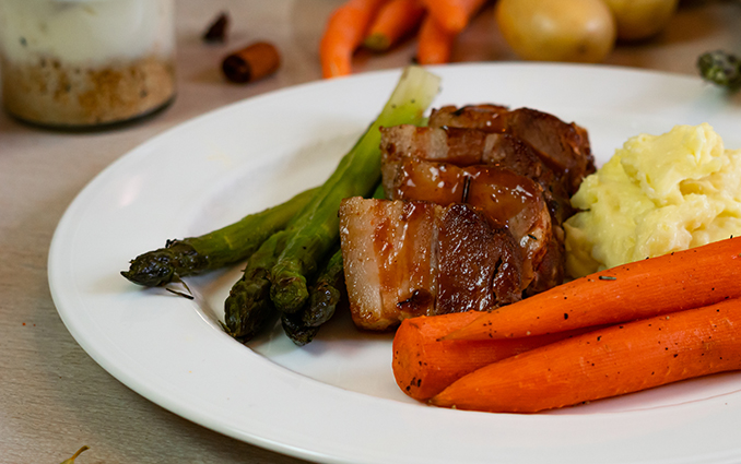 Das Ergebnis ist ein saftiger Schweinebraten mit einem aromatischen Eigengeschmack - raffiniert gewürzt und abgeschmeckt mit Knoblauch, Lorbeerblättern, Chili und Ingwer. Natürlich kommen auch zu diesem Menü unsere klassischen Beilagen: grüner Spargel, Karotten, Blumenkohl und Rosmarinkartoffeln. Verpassen Sie der Kruste nur noch einen extra Crunch im Ofen oder auf dem Grill.